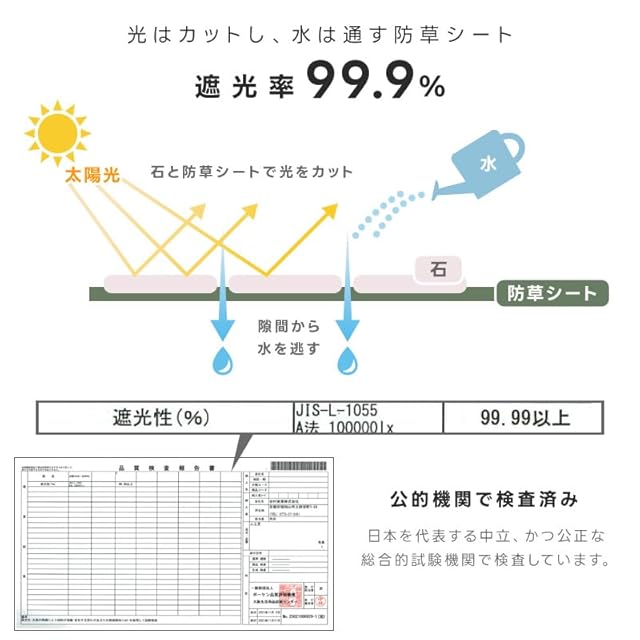 【雑草防止用シート付】日光を遮りつつが通る仕様なため、お庭の雑草が育ちにくい構造に。敷くだけで防草効果もございます。また、プラスチック製のジョイント式ではございませんので、若干の凹凸があっても地面に沿って敷く事が出来ます。