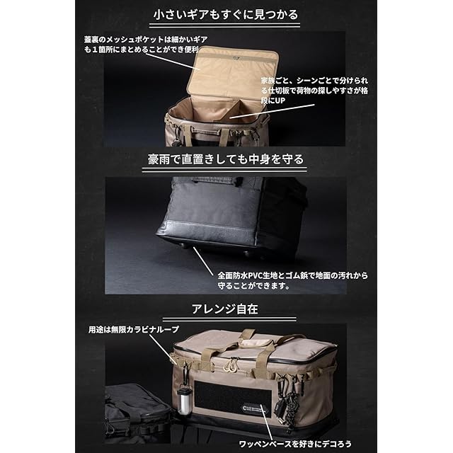 タフで大容量。たくさんの荷物をすっきりまとめるChillCamping収納ボックス。 アウトドアやキャンプはもちろん、普段使いのエコバックとしても。 ふた裏ポケットやカラビナループのツールかけなど、細部までこだわりました。 使わない時は折りたたみ可能。また、全面にある取手で奥から引き出せます。 またお客様のご意見を生かし、仕切り版と底板を付け、アップデートいたしました。