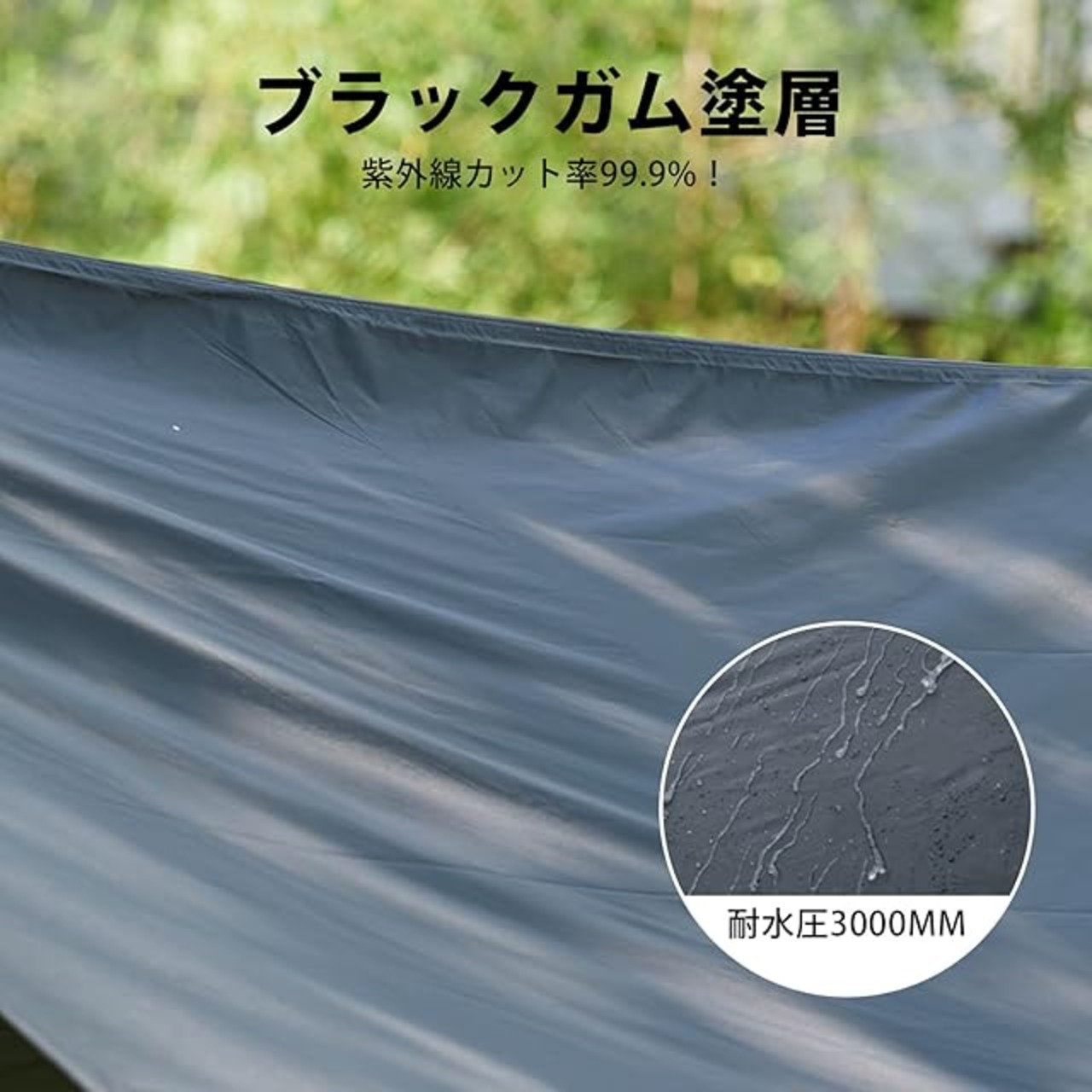 【撥水加工・耐カビ】遮光性、耐水性に優れ、3000mmの耐水圧と十分な防水性を保っています。しっかり撥水加工により、不安定の天候もOK。また、このタイプのタープは防カビ性に優れており、湿った状態でもカビが生えにくくなっています。ハンモックやテントと併用する事により、日差しや雨よけになり、快適なクッキングスペースを設けることができます。