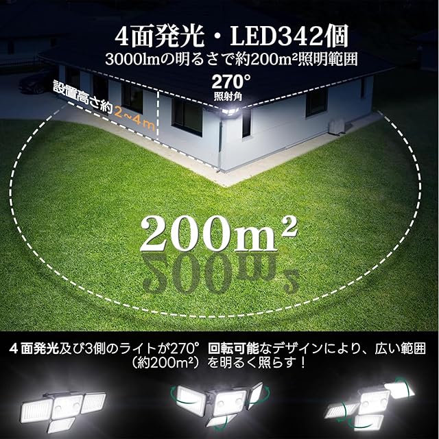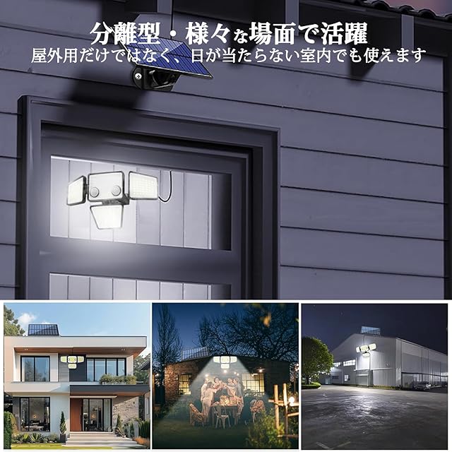 商品名:センサーライト 屋外 ソーラーライト 分離型 【342極高輝度LED・4面発光・2つ人感センサー・3000lm】 3つ知能モード 360°角度調整 リモコン付き IP65防水 2400mAh大容量バッテリー 電気代0 設置簡単 防犯 ガーデン/壁掛け/庭先/表玄関/駐車場など適用 地震/津波/台風/防災に対応 日本語説明書付き
