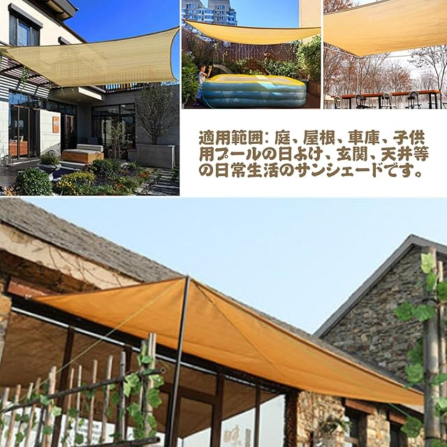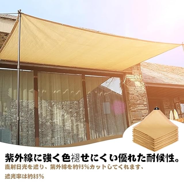 【製品仕様】サイズ:2m×3m;色:ベージュ;耐久性に優れた高密度なポリエチレンを使用した日よけシェードです。 【UV紫外線カット】直射日光を遮り、室内の温度上昇を抑えることができます。UVカット効果のある素材を使用することで、紫外線も遮ることができ、肌や家具の劣化を防止することができます。シェード下の地表温度も下げ、風も通しますので夏でも外で快適に過ごすことができます。 【節電対策に】窓際に取り付けることで、日差しなどの太陽熱の影響を和らげ、室温上昇を抑制します。エアコンの使用も抑えられますので、節電に最適です。 【取付け簡単】ハトメの穴数も4辺に十分な数があり。生地が強くて遮光性も良さげ、付属で白い紐がついていましたそして 設置はとても簡単でした。汚れても水洗いができ、お手入れが簡単です。オフシーズンの時にて頂き畳んでコンパクトに収納が出来ます。 【適用場所】日よけ用の定番シェードオーニングです。バルコニー、庭、庭下、庭先、屋外、ベランダ、ガーデン、窓用、廊下、玄関、駐車場等様々な場所にご使用頂けます。