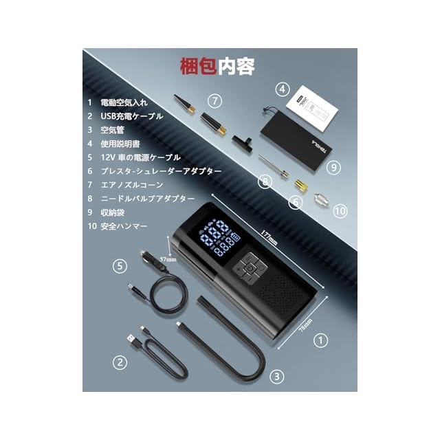商品名:TEMOLA 自転車 空気入れ 電動 電動空気入れ バイク 車 用 コードレス 最大圧力150PSI 自動停止 多機能電動入れ Type-C出力ポート急速充電 自動車/自転車/ボール/浮き輪/バイク対応 入れ 小型 低騒音 SOS/LED懐中ライト 収納袋 日本語取扱説明書付き