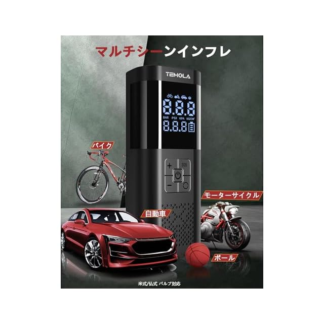 TEMOLA 自転車 空気入れ 電動 電動空気入れ バイク 車 用 コードレス 最大圧力150PSI 自動停止 多機能電動入れ Type-C出力ポート急速充電 自動車/自転車/ボール/浮き輪/バイク対応 入れ 小型 低騒音 SOS/LED懐中ライト 収納袋 日本語取扱説明書付き