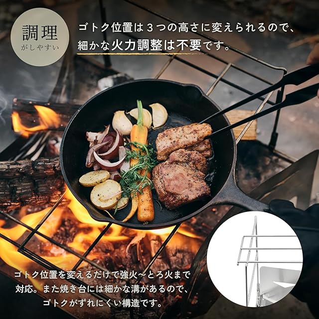 【焼き台のメリットで快適な焚き火】マクライト2の焼き台は、調理の有無や軽量化を考慮して着脱が可能。さらに、五徳の高さを3段階に変更できるため、火力の調整が不要です。これにより、調理時の面倒な火力調整をすることなく、快適に焚き火や調理を楽しめます。