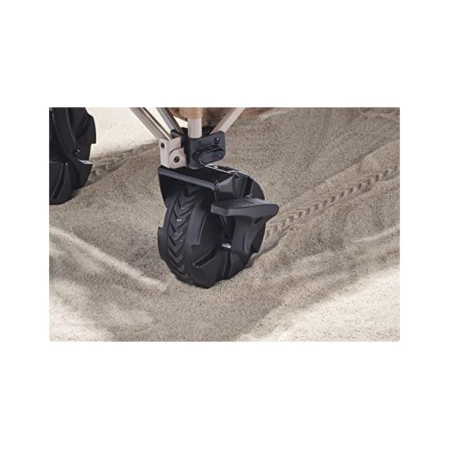【ワイドタイヤ】通常のアウトドアワゴンよりも幅広のワイドタイヤを採用し、砂地や芝生、不整地などでもスムーズに移動できます。タイヤにはストッパーが付いており、坂道でもしっかり固定できるので安全です。また、ワンタッチで取り外し可能なので、荷台だけ車に積むことが可能です。
