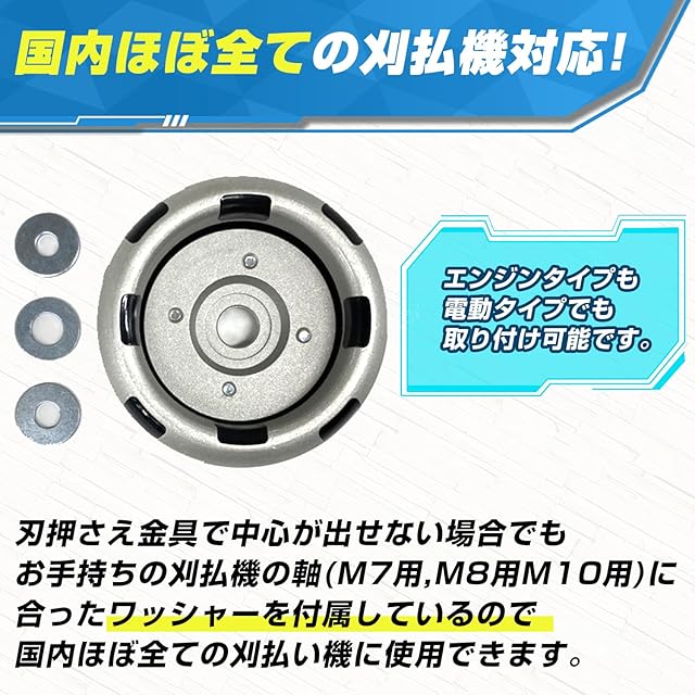 国内ほぼ全ての刈払い機対応:刃押さえ金具で中心が出せない場合でも お手持ちの刈払機の軸(M7用,M8用M10用)に合った ワッシャーを付属しているので 国内ほぼ全ての刈払い機に使用できます。