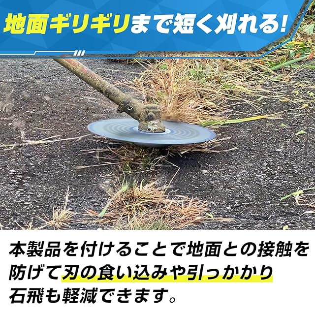 ③地面ギリギリまで短く刈れる:本製品を付けることで地面との接触を防げることで 刃の食い込みや引っかかり、石飛も軽減できます。