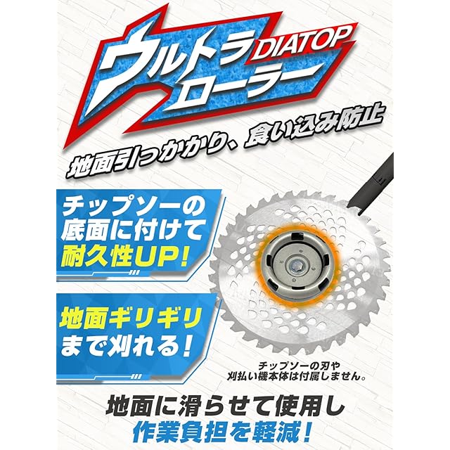 草刈り時の地面引っかかり、食い込み防止のためのアイテム、ダイアトップウルトラローラー!チップソーの底面に付けて使用してください。