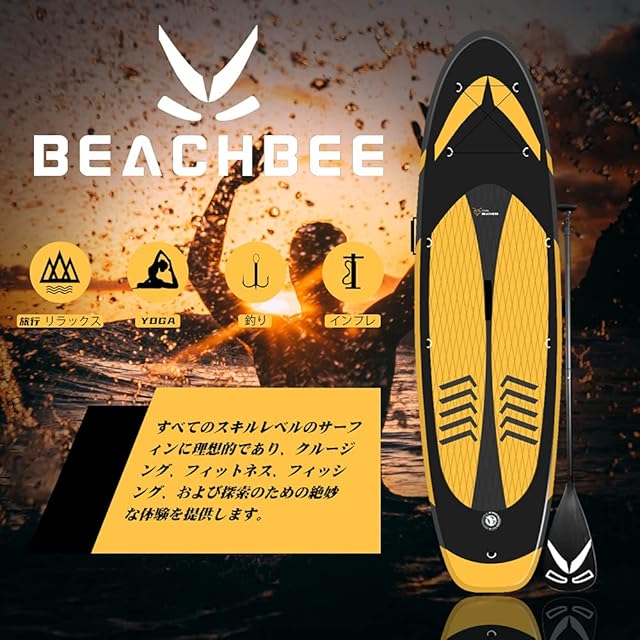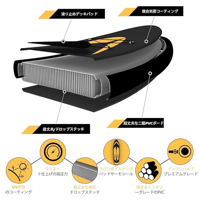 「耐久性高い&滑り止め」このサップボードは高品質ミリタリーグレードPVC、超丈夫なドロップステッチ材料、UV耐性のコーティングとEVAを使用し、耐久性高いのボードになる。ボードの中部の滑り止めパッドは水に濡れで滑りにくいになっています!初心者でも手軽に安心して遊びます