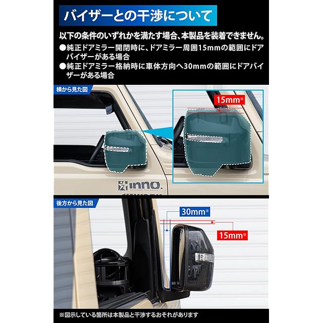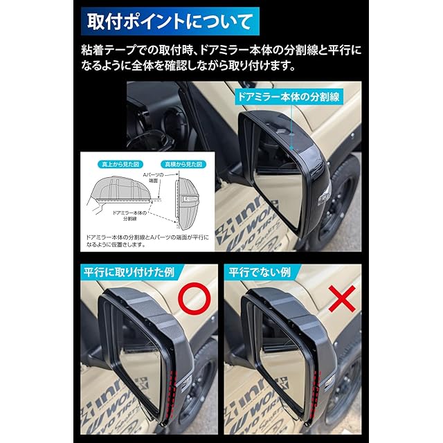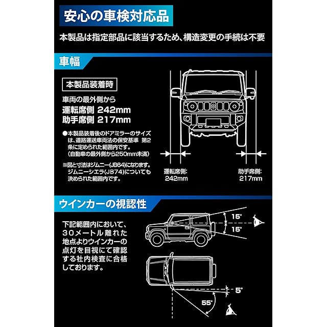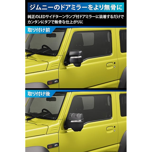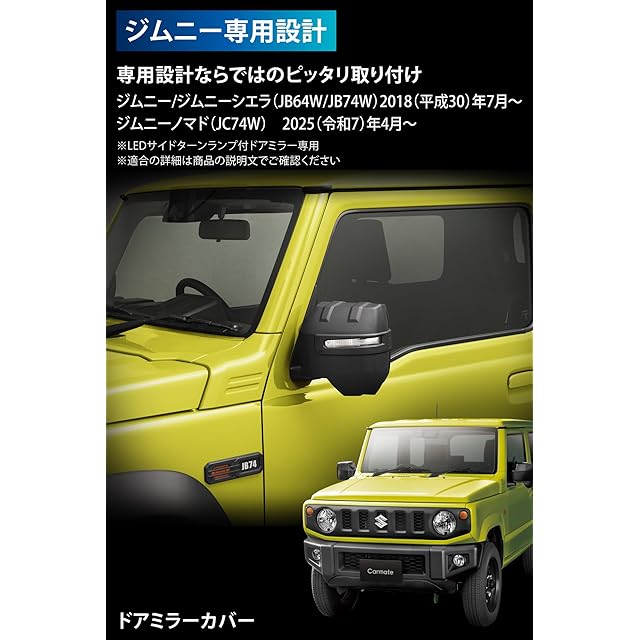 【お求めいただく前に] ・本製品は以下の車種の右ハンドル車、LEDサイドターンランプ付ドアミラー専用です。 スズキ ジムニー 型式:JB64W 年式:2018(平成30)年7月~ 適合する主なグレード:XC スズキ ジムニーシエラ 型式:JB74W 年式:2018(平成30)年7月~ 適合する主なグレード:JC ※調査日(2025[令和7]年1月)以降の仕様変更車には適合しない場合があります。 ・ドアバイザーとの干渉について 以下の条件のいずれかを満たす場合、ドアバイザーと干渉するため本製品を装着できません ・純正ドアミラー開閉時に、ドアミラー周囲15mmの範囲にドアバイザーがある場合 ・純正ドアミラー格納時に車体方向へ30mmの範囲にドアバイザーがある場合 ・本製品はLEDサイドターンランプ付ドアミラーに粘着テープで貼り付ける製品です。 ・本製品は粘着テープが強力なため、一度装着すると取り外しはできません。 ・本製品はドレスアップパーツです。ドアミラーの保護を目的とした製品ではありません。