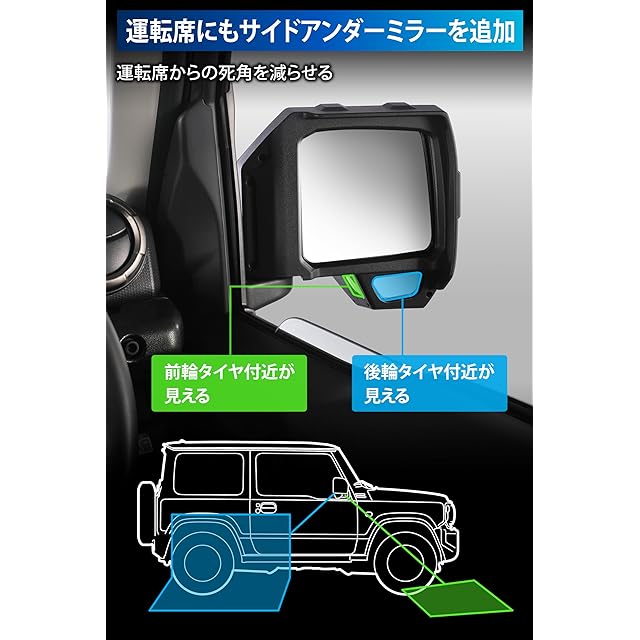 【より駐車しやすくなる運転席側サイドアンダーミラー(後方用)】 本製品を装着するだけで、純正装備の助手席側サイドアンダーミラーと同様の機能を持つサイドアンダーミラー機能を運転席側に付加することができます。 運転席側にもサイドアンダーミラーを装備できるので、駐車場の車両左右の白線を目視することができ、よりスムーズに駐車できることをサポートします。 なお、運転姿勢に合わせて上下左右調整が可能です。 【フロントの死角を補う運転席側サイドアンダーミラー(前方用)】 運転席側のフロントタイヤ付近を映せるので林道等狭い道路でタイヤの位置を確認できます。