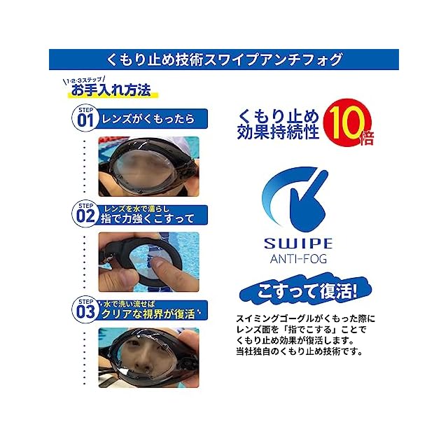 こするだけでくもり止め効果が復活するSWIPE搭載。まぶしさを抑え、集中力を高めるミラータイプ。屋外での使用でも安心のUVカットレンズ。フェイスラインによって選べる5サイズの鼻ベルト付