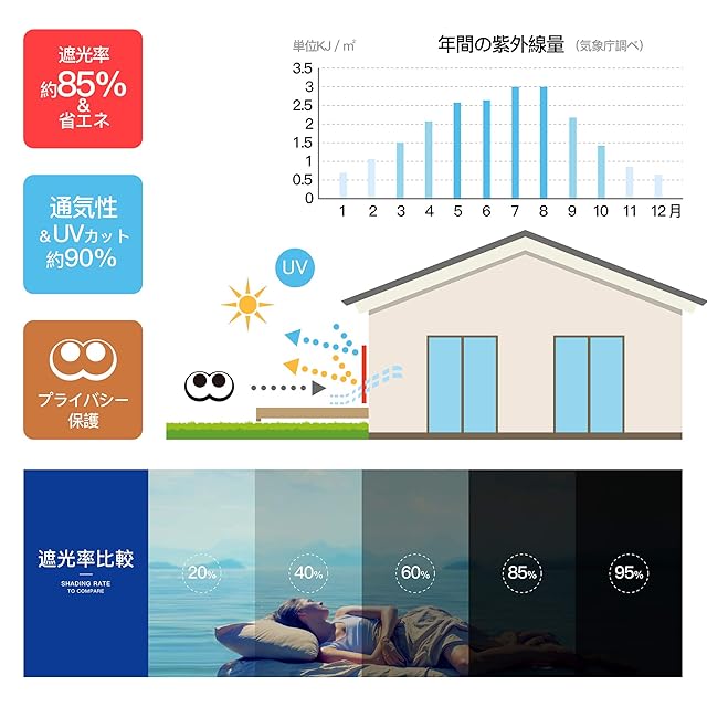 紫外線UVカット率が90%以上,遮光率は約85%。紫外線に強い、色褪せや紫外線劣化に強い糸で織られた生地を使用。