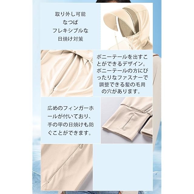 【人間工学に基づいたデザイン】取り外し可能なつばと帽子の紐は、着脱可能で持ち運びしやすいデザインとなっており、さまざまな日焼けシーンに対応することができます。ポニーテールを出すことができる、髪を結ぶ女性にとって非常に便利なデザインとなっています。また、指付きアームカバー、フェイスカバーのデザイン、手の甲、顔の日焼け止めについても非常に重視しており、全面的な日焼け止め対策に力を注いでいます。収納に便利なシームレスなファスナーポケットが付いており、見た目が美しいだけでなく、落とし物もしにくくなります。
