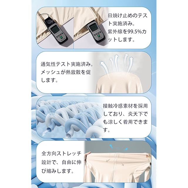 【ひんやりとした肌触り&軽くて快適】接触冷感素材は軽量で柔らかく、放熱性が良いのが特徴です。赤ちゃんに使用できるほどの快適な生地を採用しており、肌に触れるとひんやりとして蒸れません。また、UVカットウェアは小さくてコンパクトで型崩れしないため、バッグに簡単に入れることができ、持ち運びに便利です。
