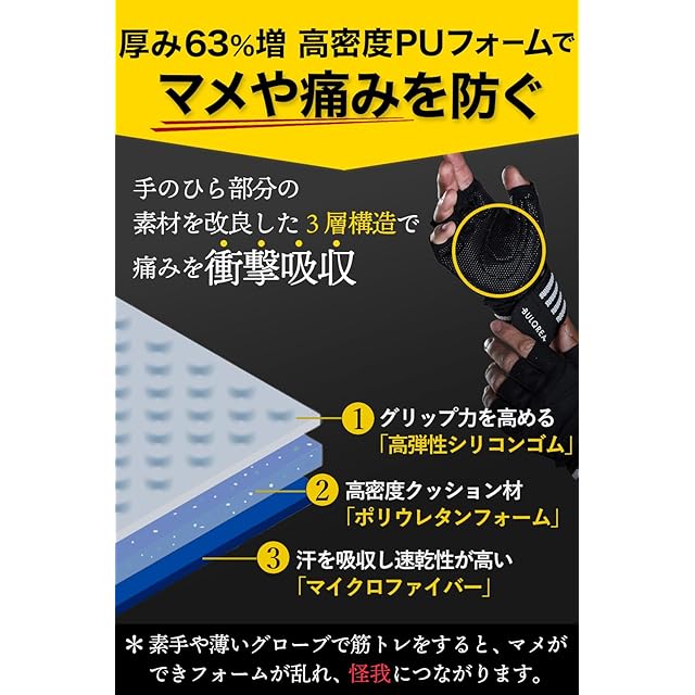 【マメ防止のための3層構造】筋トレの悩みの上位にマメができる&マメが痛くて筋トレに集中できないことです。3種の素材が、トレーニンググローブ中の手のひらにかかるの負荷をしっかり吸収&保護しマメ防止に役立ちます。