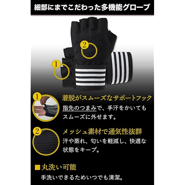 【多機能仕様】1:親指部分がタオル地になっているので、汗が出た時にトレーニングを妨げずにサッと簡単に汗を拭けます。 2:フィン付きのためトレーニング後の汗をかいた手でも簡単にグローブを外すことができます。