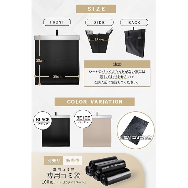 商品名:POPOT(ポポット) 車 ゴミ箱 【多車種対応フック】 車用ゴミ箱 スリム 収納 小物入れ 袋付き カー用品 便利グッズ (ブラック)