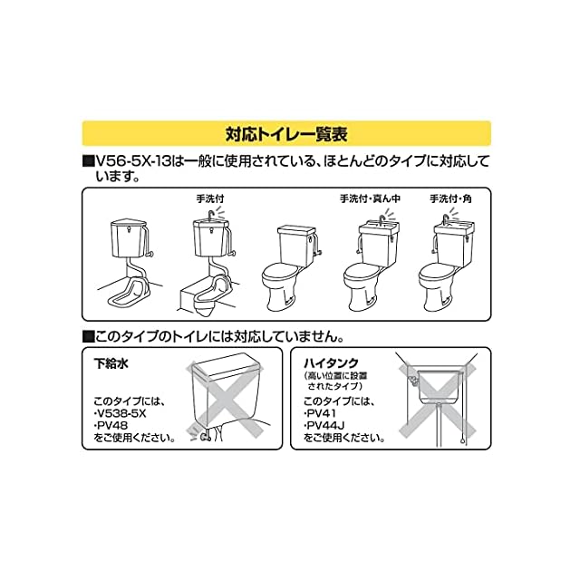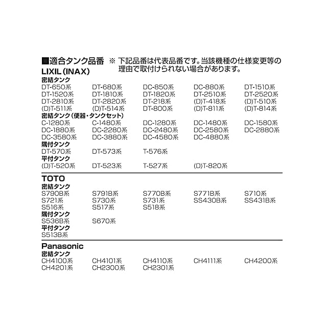 万能タイプなのでほとんどのタンクに取付できます。詳しい適応タンクは商品画像をご覧ください。※下給水・ハイタンクのトイレには対応していません。