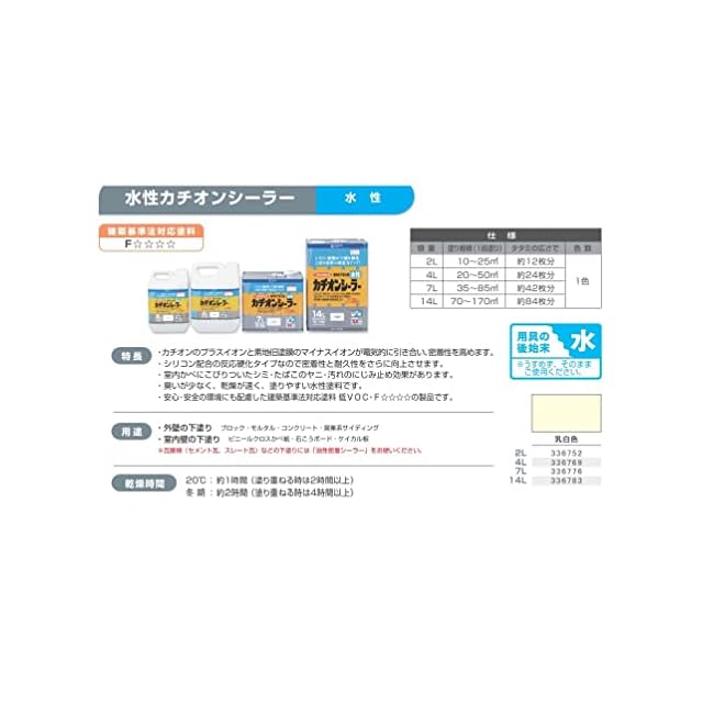 【乾燥・塗重時間】 【20℃】乾燥時間:約 1 時間 塗重時間:約 2 時間以上 【冬期】乾燥時間:約 2 時間 塗重時間:約 4 時間以上 【塗り面積(1回塗り)】 2L:平方メートル:約 10 ~ 25 m² タタミの広さ:約 12 枚分 4L:平方メートル:約 20 ~ 50 m² タタミの広さ:約 24 枚分 7L:平方メートル:約 35 ~ 85 m² タタミの広さ:約 42 枚分 14L:平方メートル:約 70 ~ 170 m² タタミの広さ:約 84 枚分