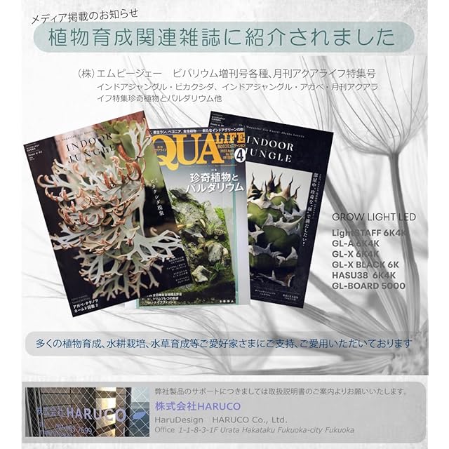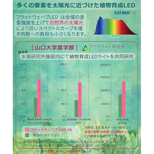 植物への育成効果や効能は国内の植物育成ライト研究所(山口大学アグリライト研究所)にて実証され他製品との性能差等を共同研究しています。