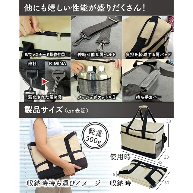 ◆365日使える大容量保冷バッグ/RIMINAの35L大容量クーラーバッグは、年中使える頼もしいアイテムです。アウトドアやスポーツはもちろん、お買い物や旅行など多岐にわたるシーンで活躍します。30Lを超える容量でありながら、わずか500gという軽量設計で、持ち運びも楽々。肩ベルトが付いているため、手持ちでも肩掛けでも利用できる3WAY仕様です。特にレジカゴサイズにぴったりのデザインは、お買い物後の持ち運びに便利。ベルトでコンパクトに折りたたむことができるので、使わない時も場所を取りません。見た目もおしゃれで、ツートンカラーが魅力のこのバッグは、日常使いからアウトドアまで幅広く対応します。 ◆超大容量、でもコンパクトに収納/このクーラーバッグは、35Lの大容量にもかかわらず、コンパクトに収納できる優れもの。レジカゴサイズで、お肉のパックや2リットルのペットボトルもラクラク収納可能です。特にゴムベルトを使えば、使わない時には簡単に折りたたんでコンパクトに収納できる点が魅力的です。Wファスナー付きで荷物の出し入れがしやすく、また、防水設計が施されているため、冷たい飲み物や氷を入れても水漏れの心配がありません。こうした多機能性と使い勝手の良さが、日常のお買い物やレジャーを一層便利にしてくれます。 ◆優れた品質と機能/RIMINAのクーラーバッグは、品質と機能性の両方を兼ね備えています。内部には、PEVA、不織布、5mm発泡ウレタン、撥水オックスフォード生地の4層構造を採用し、保冷力を強化。さらに、内部にはホットプレス加工が施され、水漏れを防止する設計になっています。外部は全面撥水生地で作られており、汚れやキズに強く、耐久性に優れています。肩ベルトは取り外し可能で、肩掛け時には肩パッドが付いているため、長時間の使用でも肩に負担をかけません。こうした高品質な素材と多機能なデザインが、クーラーバッグを長く愛用できるポイントです。 ◆選べるカラー・製品仕様/RIMINAの35L大容量クーラーバッグは、シンプルでスタイリッシュなツートンカラーが特徴です。ベージュとダークグレーの2カラー展開で、どちらもシーンを問わず使いやすいデザインです。肩ベルトは取り外し可能で、必要に応じて手持ちでも肩掛けでも対応可能。ストラップ部分には調整可能な肩パッドが付いており、長時間の使用でも肩に負担をかけません。軽量でありながら、保冷力や耐久性に優れたこのクーラーバッグは、キャンプやピクニック、スポーツイベントなど、あらゆる場面で活躍すること間違いなし。便利な収納ベルトが付いており、使用後は簡単に折り畳んで収納できます。 ◆安心の日本販売店 / RIMINA(商標)ブランドの製品は、大阪府枚方市で運営を行っているネットショップの株式会社RIMINAが責任を持って販売いたしております。 海外の販売店と違い、日本人担当者指示による検品体制を取っており、90日の延長も行なっております。万が一の不良等があった場合にも、 しっかりとやアフターサポートをさせて頂きますので、安心してご購入下さい。