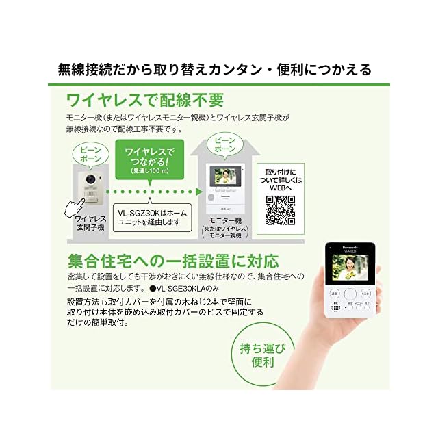 【特徴】配線工事不要で取付簡単なワイヤレステレビドアホンです。ワイヤレス玄関子機の電池持続時間が約2倍にアップ(VL-SGD10L(2016年製)との比較)し、(パナソニック製充電式エネループハイエンドモデル6本の使用で)最大2年間使用可能になりました。留守中の来訪者画像をワイヤレスモニター親機に1件あたり3枚の連続画像(約0.5秒おき)で最大100件まで録画可能できる「自動録画機能」を搭載しています。帰宅後、モニター画面で確認できるので便利です。期間は1年間です。