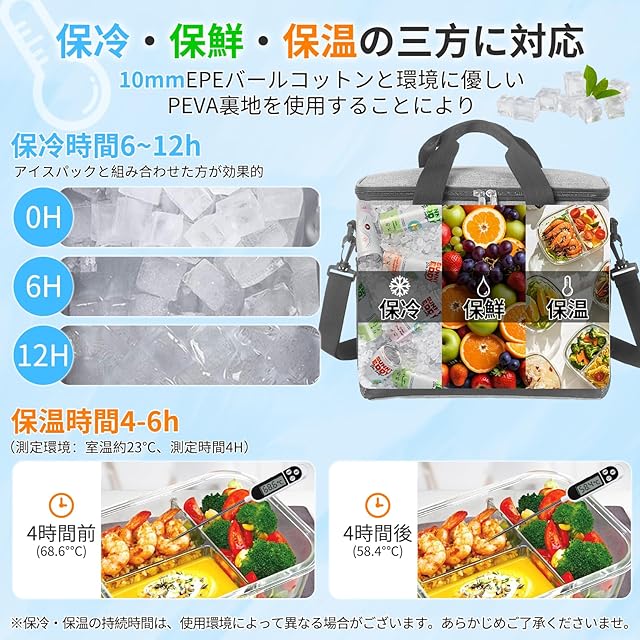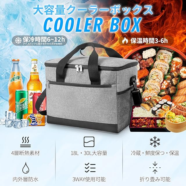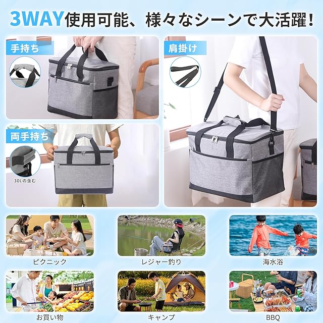 【使い勝手が抜群&様々なシーン】【使い勝手が抜群&様々なシーン】ダブルファスナー設計、耐久性があり、左右どちら側でも開くことができます。角型で蓋も大きく開くので、総菜やお弁当も傾けずにまっすぐ入れやすい。また、クーラーボックスの内部は継ぎ目のないホットプレス技術を採用したことで、より優れた漏れ防止効果を実現し、氷が水に溶けた後バッグから水が染み出す心配がなくなり、釣りなどの場合も問題なく使えます。キャンプや釣り、BBQといったアウトドアレジャーはもちろん、スポーツ、お花見、運動会、花火大会、日頃の買い物といったシーンでも大活躍します。