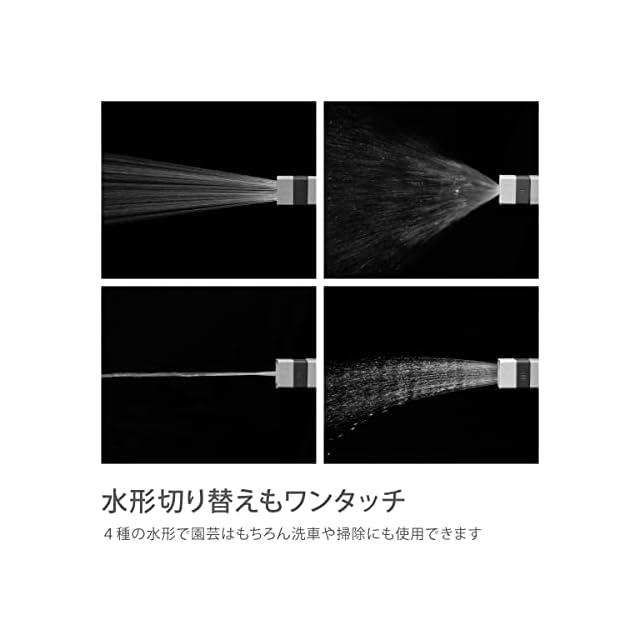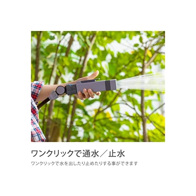 「カチッ」と握ると通水、もう一度「カチッ」と握ると通水状態が解除され止水します。ノズルの根元は可変式。角度が変わるのでホースを気にせず水やりしやすくなっています。
