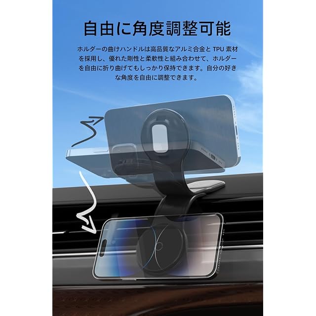 角度調整可能:車用スマホホルダーの曲げハンドル部分は高品質な形状記憶合金を採用し、優れた弾性を備えた、任意の角度に変形することができます。使用状況やニーズに合わせてホルダーの角度をカスタマイズすることが可能です。また、スマホの角度を自由に調整することができます。最適な視野角や操作性を実現することができます。