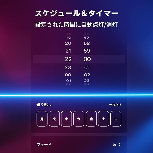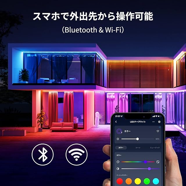【外出先から操作可能 & スケジュール機能 】ハブ不要でWi-Fi(2.4GHzのみ対応)と直接に繋げられます。外出先からスマホで操作可能。防犯対策に役立ちます。Wi-Fiモジュールのほか、Bluetoothモジュールも搭載しているので、ルーターが故障やWi-Fi 環境が不安定でも操作可能。また、アプリからスケジュール設定しておけば、毎日決まった時間にLEDテープライトが点灯させることができます。
