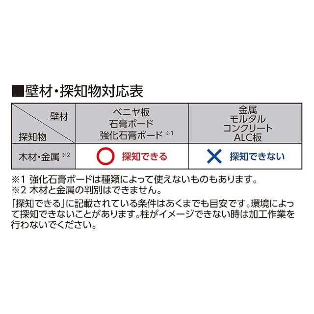 探知可能下地材:木材・金属 ※木材と金属の判別はできません 厚み:35mmまで