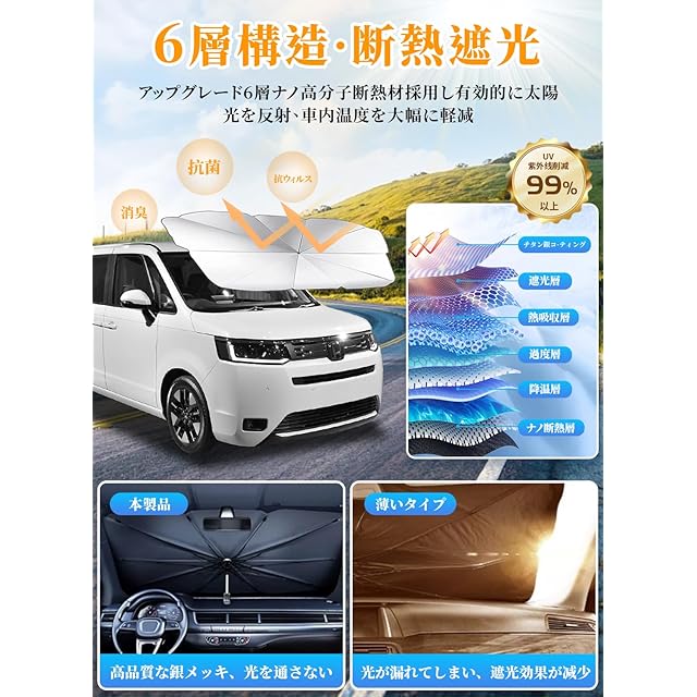【サイズごと対応想定車種】市場に出回っているほとんどのモデルに対応できます、たとえば軽自動車SUV、トヨタ、N-BOX、ダイハツ タント、スズキ、ホンダ N-VAN、ミニバンなど。展開時:約135×75cm、持ち手部分(伸ばした状態)約31.5cm。重量:約270g、収納袋付き.収納サイズ:35cm*12cm*10cmだけで、傘のように持ち運びに便利です。ご購入前に車のサイズを測ってください。