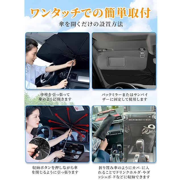 【使用方法】 1.折りたたみ傘と同じ方法でサンシェード開いてください。 2.銀色の表面を外に向けて、サンシェードをフロント ガラスに取り付けます。 3.運転席と助手席のサンバイザーをおろし、サンシェード を固定して完成です。