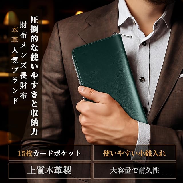 [GSG] 財布 メンズ 長財布 さいふ 本革 人気 ブランド 小銭入れ 大容量 カードケース ラウンドファスナー 紳士 男性用 財布 父の日 プレゼント グリーン カード15枚収納 22044 | Trend Design BASE店