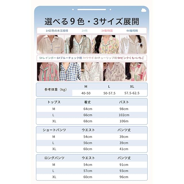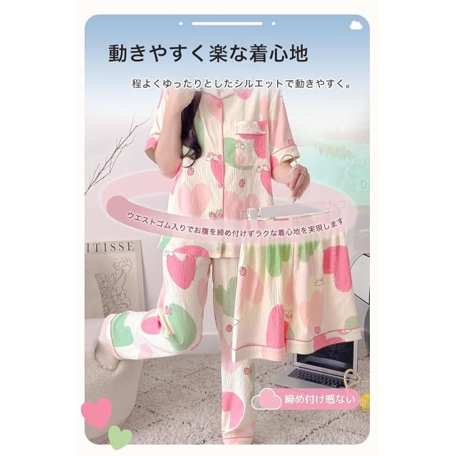【おしゃれなデザイン】トップスは前開きタイプで、風邪をひいて体調がすぐれないときや、肩が痛いときなどでも脱ぎ着しやすいのがありがたいポイントです。左胸にポケット付き、小物の収納に便利です。Vネックでお顔周りをスッキリ見せて鎖骨を美しく映えさせます。やさしい配色と可愛いデザインのコンビネーションより、優しい印象を与えてくれます。
