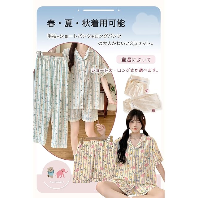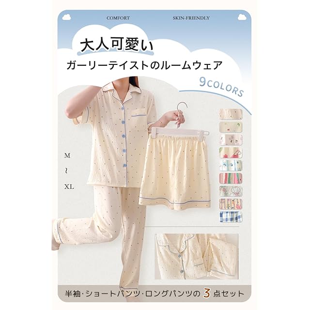 【3点セットルームウェア】半袖+ショートパンツ+ロングパンツの大人可愛いガーリーテイストのルームウェアです。3点それぞれ、単体で使い回しもOK。ルームウェアや部屋着・パジャマとしてはもちろん、ちょっとしたお出かけにも!