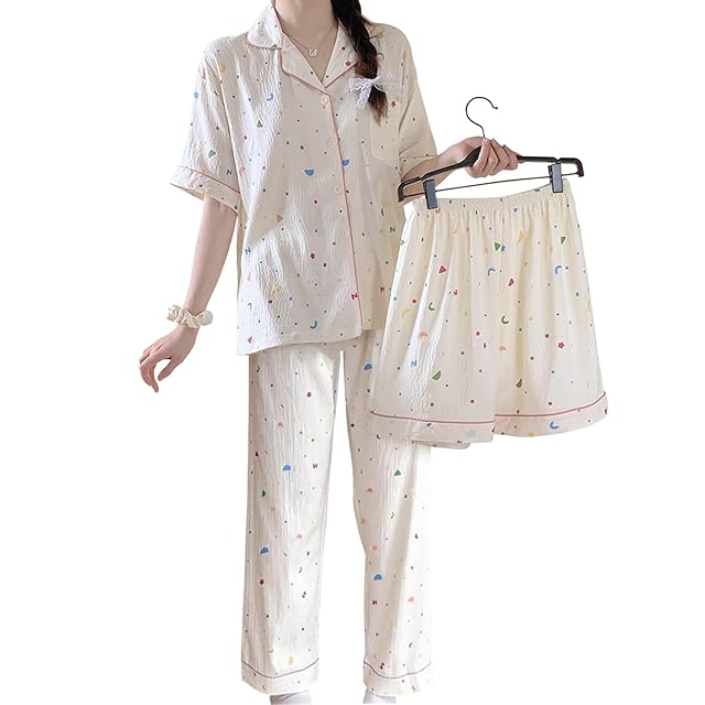 [Trnvco] パジャマ レディース 夏 前開きパジャマ 3点セット 【半袖 長ズボン ロングパンツ】 ルームウェア 可愛い 部屋着 入院着 プレゼント 女性 柔らかく 通気性 春・夏・秋 (JP, アルファベット, XL, 幾何柄)