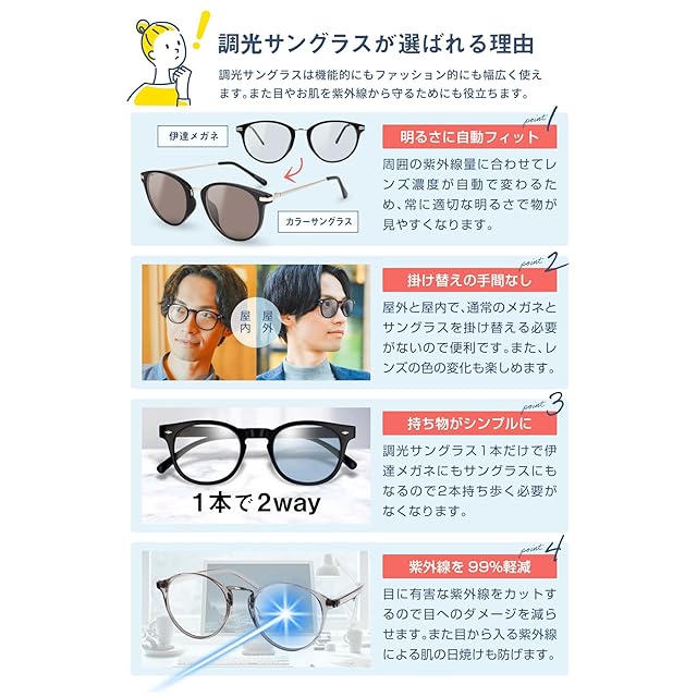【こんなメリットが!】 ・紫外線量に応じて自動調整: 周囲の紫外線量にレンズが賢く反応し、常に適切なレンズ濃度に自動調整してくれます。 ・掛け替え不要の快適さ: 屋内外の移動や天候の変化で、いちいちサングラスを掛け替える手間がありません。 ・いつでもクリアな視界: 眩しさを適切に抑え、目の疲れを軽減。様々な光の状況下で見やすさを保ちます。 ・もちろんUVカットも: レンズの色に関わらず、目に有害な紫外線はしっかりブロックします。(※本製品のUVカット性能をご確認ください)