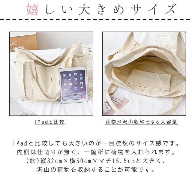 メイン素材: キャンバス<br><br> ストラップの種類: ショルダー<br><br> 幅:45cm 高さ:35cm マチ幅:17cm<br><br> ウォッシュをかけたキャンバス素材はくったりと柔く、肩にかけた際も馴染みやすく ストレスフリーな持ち生地&さらに、どこか褪せたような独特のおいろで、おしゃれな雰囲気を漂わせます。<br><br> たーっぷり中に詰め込めるので、用途は様々。荷物の多い方の通勤通学にはもちろん、 着替えの必要な習い事のシーンや、旅行、マザーズバッグに使用される方も多いよう! キャンバス素材ならではの扱いやすさも魅力です。<br><br> 【ファスナー付き】ファスナーがついているので貴重品なども安心です。大きな開き口、中身が見やすく、物が落ちる心配がありません。<br><br> 【肩掛けトート 大容量 一泊旅行】トートバッグ日常の必需品をまとめて収納できる大容量のトートバックです。一泊旅行に 着替えや化粧品などを入れて十分に活用できます!<br><br> 【男女兼用なショルダーバッグ】毎日使いたくなる男女兼用なキャンバストートバッグが登場!肩紐が調整できます。ショルダー部分が太いので、肩の食い込みが軽減されます。肩にかけたり、斜め掛けにしたり、いろいろな持ち方ができます。<br><br> 【実用的なトートバッグ】通学通勤用はもちろん、ちょっとした旅行バッグとしても使えます。トートバッグは高密度のキャンバス材質でとても丈夫で長く使えます。