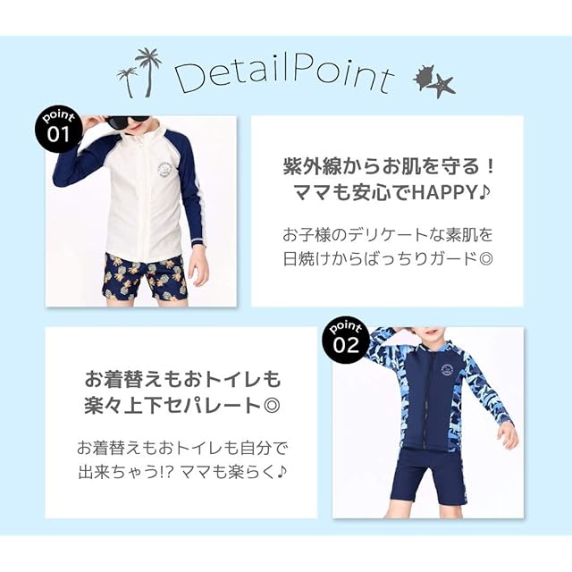 キッズ 水着 男の子<br> 90cm~140cm 3SET<br> <br> - CheckPoint -<br> 「サメ柄&パイナップル柄でリゾート感たっぷり!キッズ水着」<br> 組み合わせに迷わない!トータルコーデ☆<br> 長袖で首元から足首までカバー!<br> キャップ付き3点セットだからママも安心HAPPY♪<br> <br> - Detail Check Point -<br> <br> point01<br> \Bタイプ/<br> けがを防ぐ!ジッパーカバー<br> スライダーがカチャカチャせず<br> 思いっきり遊んでも安全◎<br> <br> point02<br> フロント部分に裏地付き!<br> 透けずに安心な着心地◎<br> 大切なお子さまが着る水着!<br> 裏地で安心・快適な着心地に<br> <br> point03<br> ウエストは紐で調節OK<br> 身体にぴったりフィット<br> あると嬉しいウエスト調節◎<br> 身体にぴったり合わせられる♪ <br> point04<br> 熱中症対策にもなる!<br> 嬉しいキャップ付き☆<br> 頭を護るキャップがセット!<br> 手軽に全身コーデがキマる♪<br> <br> 選べる2types<br> ディテールやデザインが異なる2タイプ! お好きな水着で夏を満喫♪<br> ・・A type・・<br> ジッパーカバーなし<br> 膝上丈パンツ<br> <br><br> ・・B type・・<br> ジッパーカバーあり<br> ショートパンツ<br>