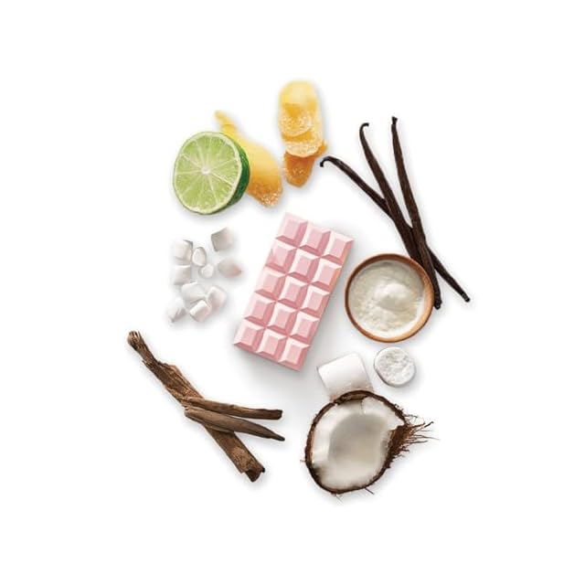 チョコレートマシュマロやミルクバニラの美味しい香りの中で、 スパークリングベルガモットとジャスミンペタルが洗練さも演出