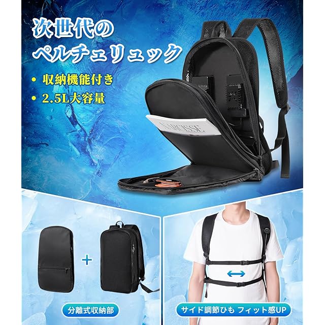 【人間工学設計&コンパクト&静音設計】人間工学設計プレートと2つサイド調整ひもで締め付け加減を調整して、ペルチェプレートが背中にぴったりし、快適なファット感!コンパクト軽量なデザインを取り入れ、体に余計な負担をかけず、快適な使い心地を実現します。カバンのように背中に掛け式なので、手を解放してくれ、涼しい超冷感を楽しめながら仕事や勉強を集中できます 。また、日本製のDC静音モーターを搭載し、作動音は31dBまで抑え、空調ウエアに比べ静音で気にならない。気温に左右されず猛暑でも抜群の冷却機能を発揮し、快適冷感で熱中症を予防し作業効率をアップします。
