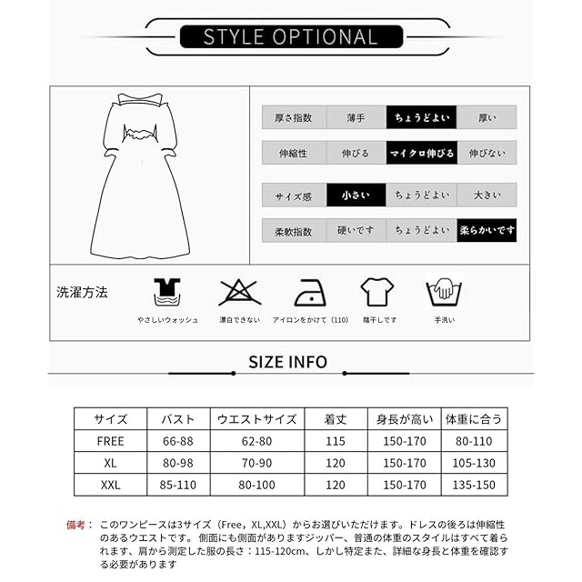 【サイズ】FREE(バスト:66-88、ウエストサイズ:62-80 、着丈:115、)/体重範囲に適している(40-55KG) XL(バスト:80-98、ウエストサイズ:70-90/体重範囲に適している(55-65KG)、着丈:120)XXL(バスト:85-110、ウエストサイズ:80-100、着丈:120)/体重範囲に適している(65-80KG)