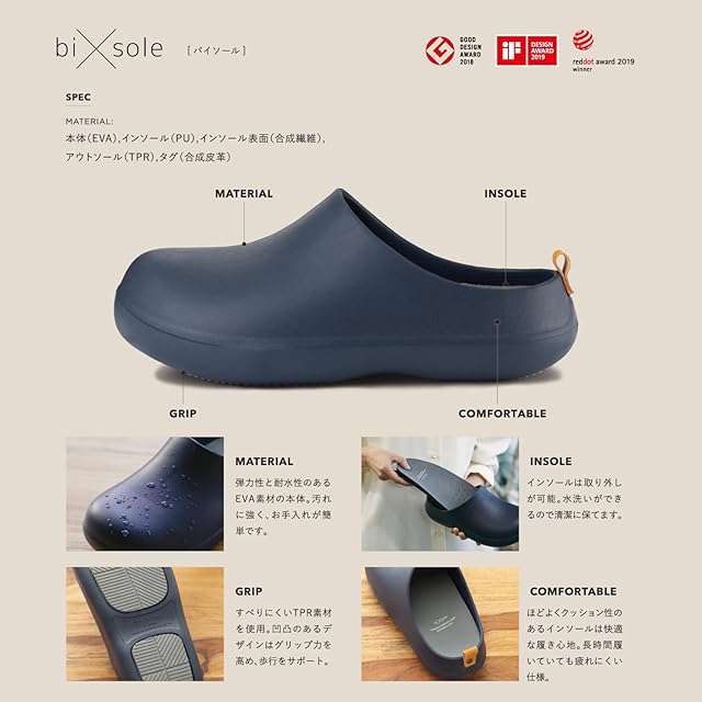 素材・材質:本体(EVA)、インソール(ポリウレタン)、インソール表面(合成繊維)、アウトソール(TPR)、踵タグ(合成皮革)