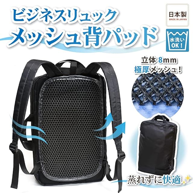 ◆商品概要◆ <br><br>通勤中の背中の汗や蒸れを解消するメッシュパッド ※リュックは製品に含まれておりません <br>◆商品説明◆ <br><br>・通勤中の背中の蒸れや汗を解消します <br>・立体構造のハニカムメッシュ(極厚8mm)を使用。熱がこもらず通気性抜群で、涼しく快適です <br>・夏の暑さ対策にぴったり。汗による肌トラブルを予防します <br>・汗による臭いやべたつきを抑えます <br>・極厚8mmのメッシュ(通常は1~4mm)のため、へたりにくく耐久性良し <br>・製品重量90gと軽いので負担は感じません <br>・どんなビジネスバッグの色にもあうブラック!<br>男女兼用商品です <br>・オールシーズン対応! <br>冬は背中のひんやり感をなくします <br>・水洗い、日干しOK! 中性洗剤で押し洗いできて清潔! <br>・固定パーツで簡単装着 <br>◆対応リュック◆<br><br> ・男女兼用、あらゆるビジネスリュックに対応しています <br>◆製品仕様◆<br><br> 素材 : ポリエステル、PVC <br>サイズ : 約縦410×横260×厚み8mm <br>カラー : 黒色 <br><br>◆製造元◆ 株式会社ヒロオカ(兵庫県丹波市) 創業69年の縫製メーカーが開発・製造した日本製のメッシュパットです。 他にも、蒸れないカーシートカバーや安全靴が洗える洗濯ネットなど、生活者の役に立つ製品開発に取り組んでいます。<br>※適格請求書発行事業者です。T2140001041267