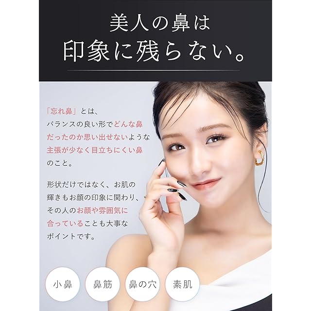 【挟んで固定し、憧れの鼻に】鼻のために設計されたクリップでしっかり挟んで固定し、形をつけます。鼻の左右から挟み込み、圧を加えながら固定することで、スマートな鼻の印象を演出します。さまざまな鼻の形を追求した商品設計により、幅広い年代・形状の鼻にフィットする独自の形状を開発しました。
