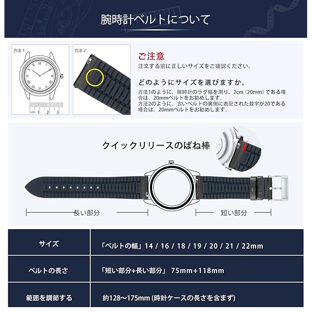 当社の時計ベルトは、6色:ブラック、ブラウン、ライトブラウン、ダークブルー、ホワイト、ベージュ、と7サイズ:14mm 16mm 18mm 19mm 20mm 21mm 22mmをご用意しており、さまざまな時計スタイルと場合に非常にフィットします。 外側は革、内側はゴムを使用したデザインになっており、時計バンドの汎用性と耐久性に優れていると同時に、普段使いしやすいスタイルになっています。 ゴム製の内側は運動に適しており、革は成熟したように見え、混合された性質により、持ち運び、運動、スポーツ、カヤック、水泳、仕事に適しています。これは確かに非常に価値のある時計バンドであり、時計に最適な選択です。