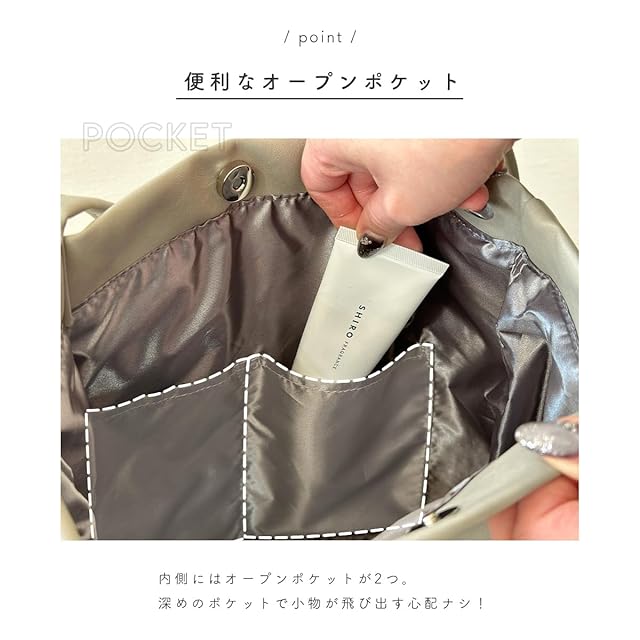 高見えする軽量素材で長時間持ち歩いても疲れにくい設計。内側には2つのオープンポケット付きで、スマホやキーケースもすぐ取り出せて、バッグの中もすっきり整理できます。忙しい朝もストレスフリー!