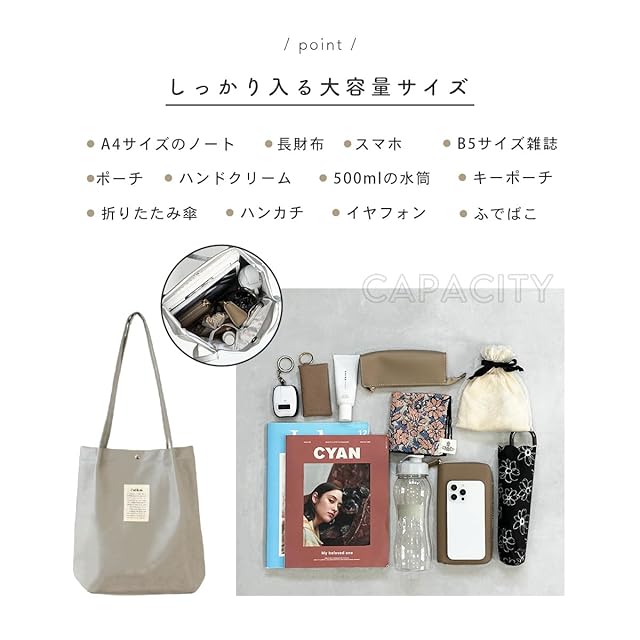 お仕事もプライベートも、これひとつでOK!シンプルデザインだから、通勤コーデにも休日のお出かけにもぴったり。A4書類や13インチのノートPCもすっぽり入る大容量で、ビジネスシーンにも活躍します。
